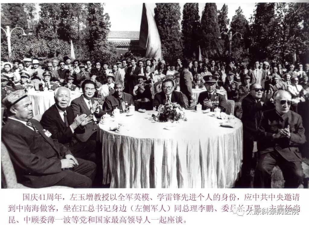 国庆41周年,全军学雷锋先进个人左玉增教授,应中央邀请到中南海做客,向首长汇报了斜颈病的研治情况。左玉增教授汇报研治斜颈病取得的成就和看到他胸前戴满了军工章,高兴的赞扬左玉增院长:“你的军功章多,说明你对人民的贡献大……”,勉励他多出成果,为更多的人解除疾苦。左玉增深知:我能坐在这里就是至高无上的奖励,是最大的鞭策和鼓励。