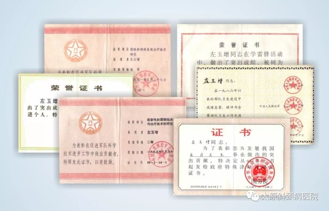 左玉增教授从医50多年,专攻斜颈病35年,精湛的技术,高尚的医德深受人民的爱戴和党的关怀。他荣立一等军功一次,二等军功一次,三等军功八次,他获军队英模,全军部队卫生建设先进个人,全年计划生育先进工作者,全军学雷锋先进个人,北京军区学雷锋标兵等荣誉称号。两次应中央邀请参加国庆庆典。
