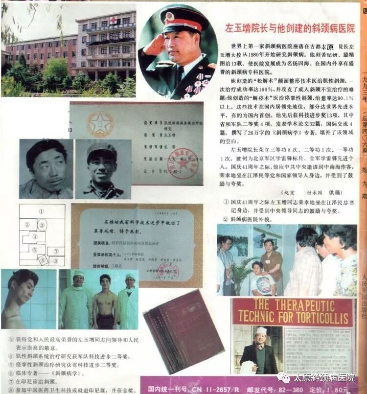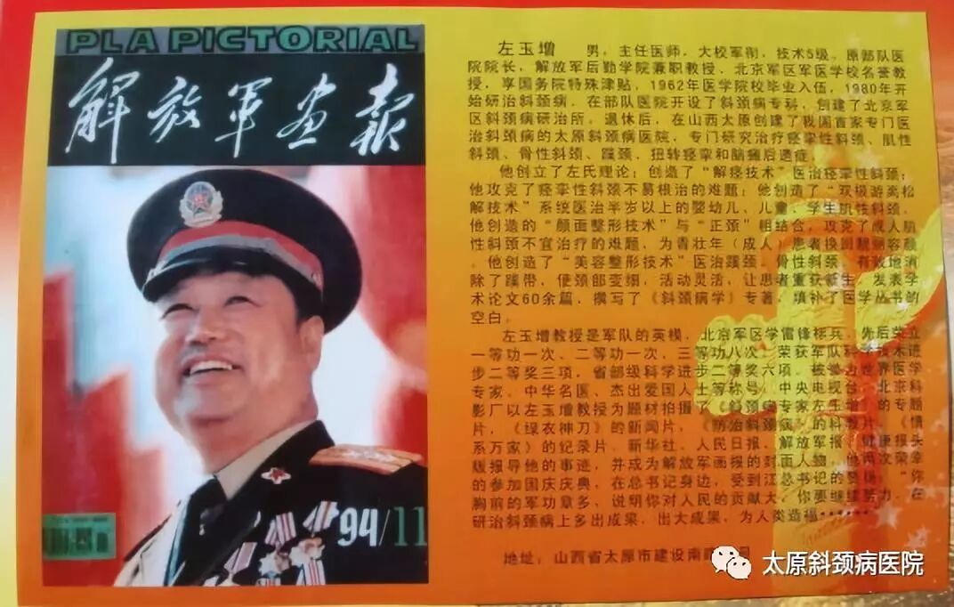 左玉增教授与斜颈患者结下不解之缘。从那以后,斜颈病人不断找上门来。1982年调他到部队医院当院长,他在医院开设了特色专科,每年都做几百例,斜颈特色专科还被列为北京军区斜颈病研究所,他在北京、天津开设了协作点。许多省市请他去做斜颈手术,还到印尼、新加坡讲学,学术交流。对斜颈病的研治工作越搞月大,成了自己的一项事业。